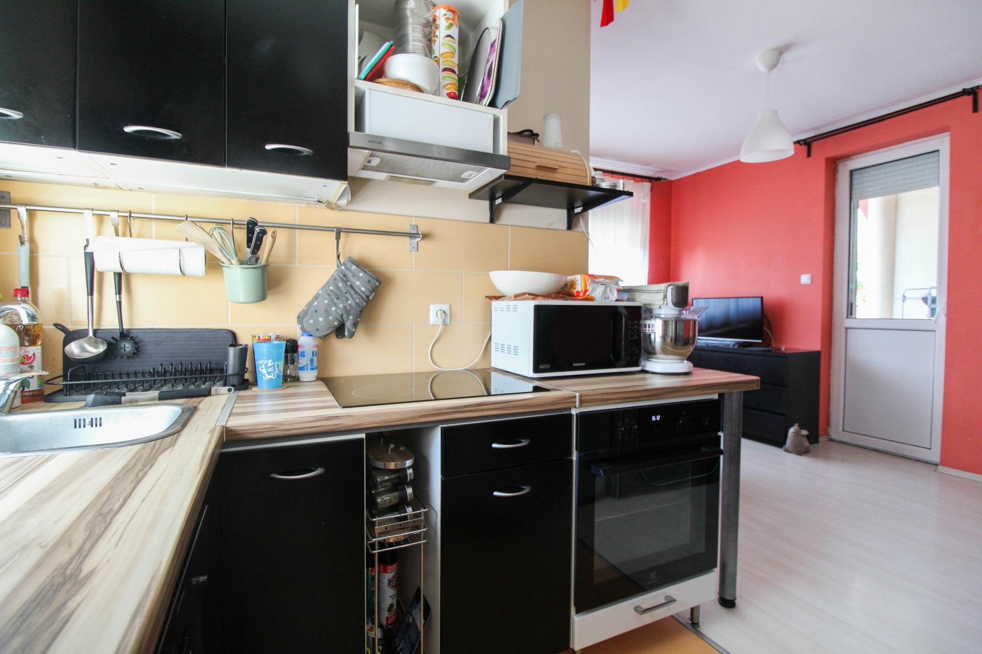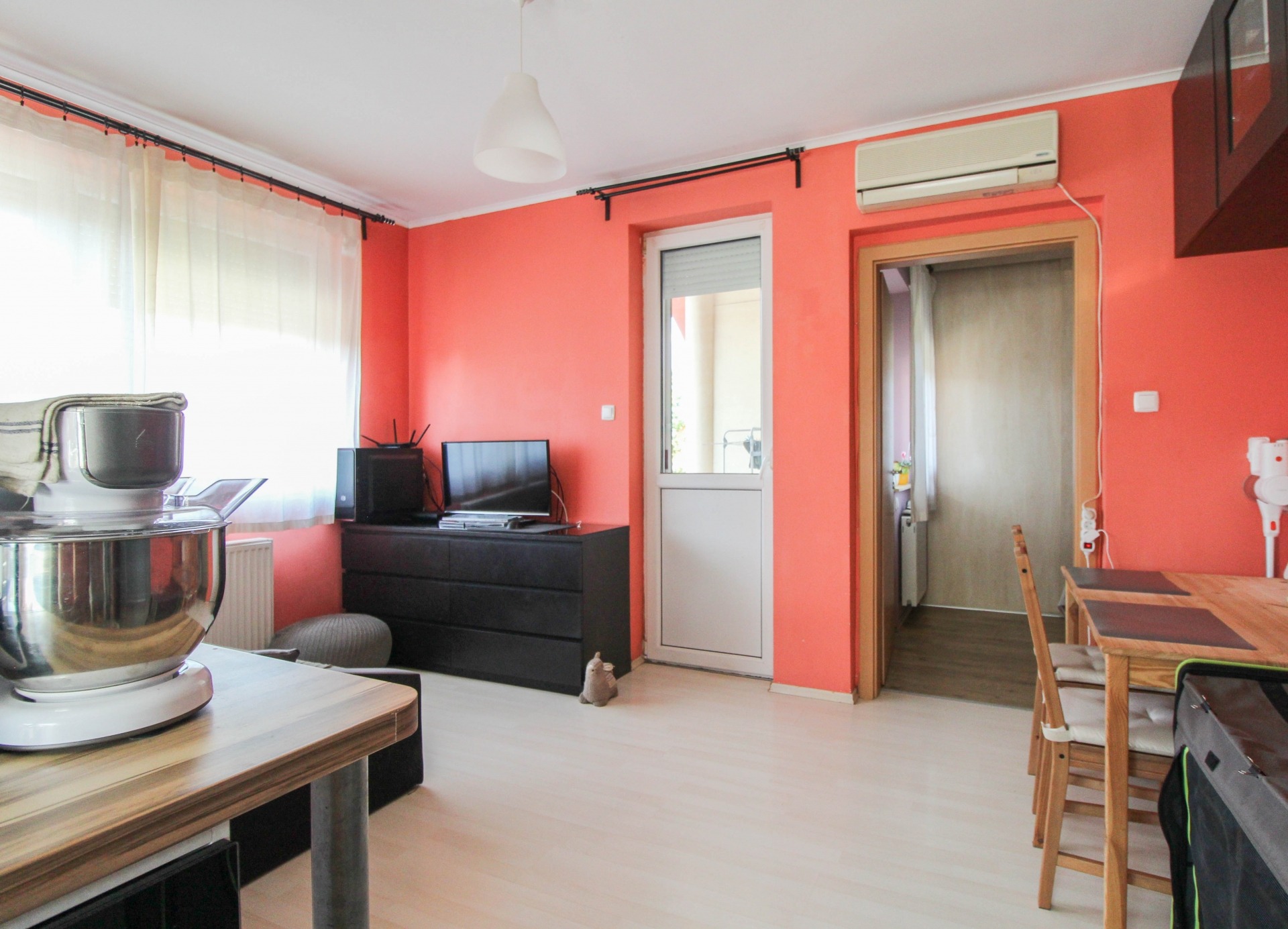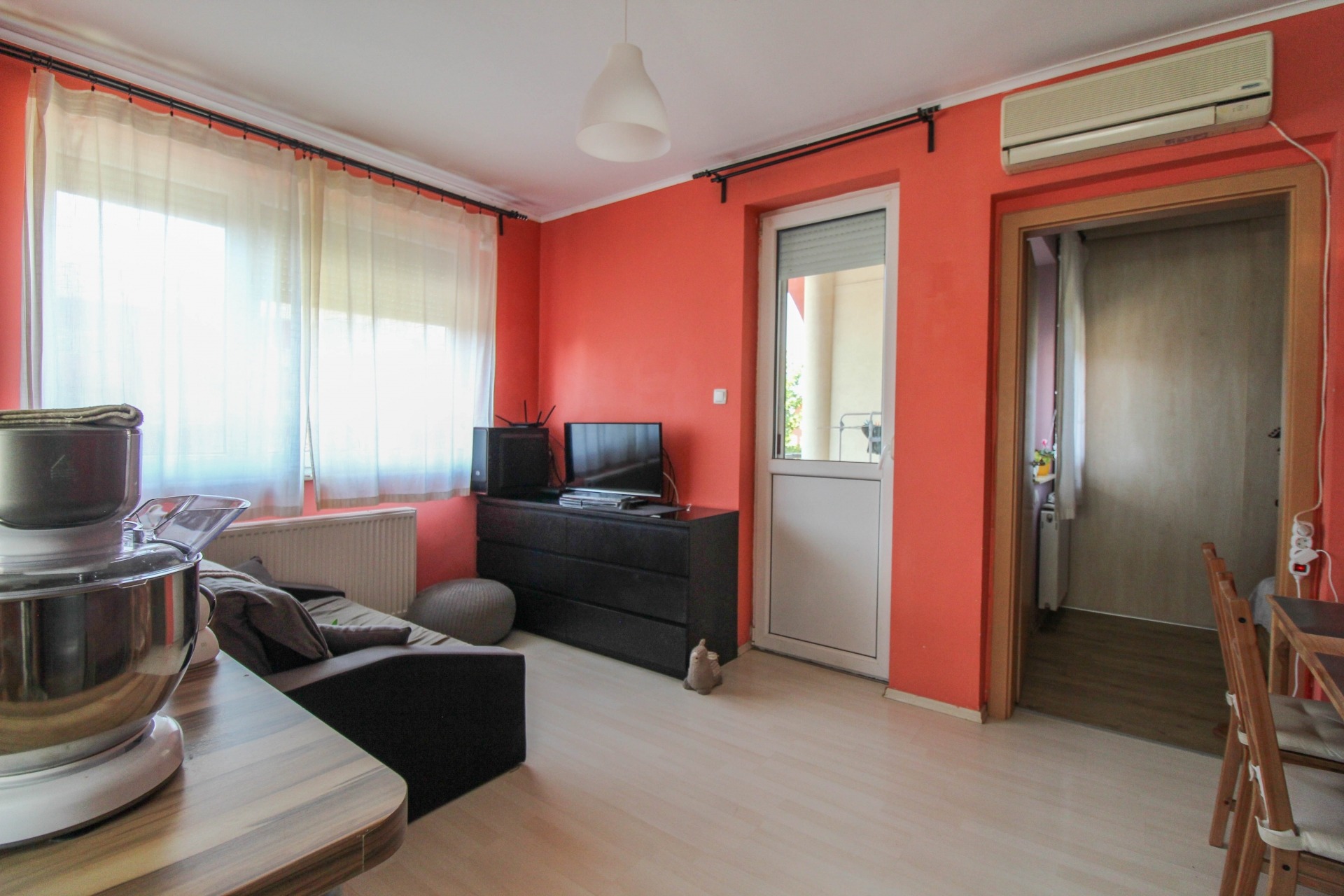 A lakásban található egy beépített szekrény, konyhabútor, valamint egy klíma a kényelmes hőmérsékletért. A lakáshoz tartozik egy dupla autóbeálló is a ház előtt.
